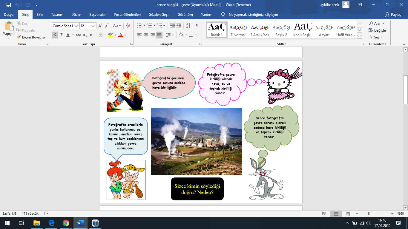 | Explore-1 | After giving prior information, “WHICH YOU THİNK? “ activity papers are distributed to students. A discussion environment is created by taking thougts and ideas about yhe activity papars from the students. Then the discussion is concluded with the class. Students are asked how to fight the pollution in the photos they see and answers are received. “Which you think “ activity questions:I agree with Candy , because:I agree with Hello kitty, because:I agree with Bambam and Çakıl, because:I agree with Bugs Bunny, because: | 10 min |